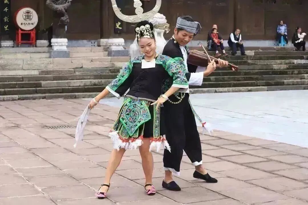 苗族古瓢舞也叫“苗族瓜瓢舞”,是苗族男女老幼喜爱的一种独特的娱乐形式,每当丰收时节和苗家节日,男性身着盛装,女性身着“百鸟衣”,由男子手持古瓢琴奏出古朴独特的音色走在前面,女子跟在后面伴随琴声摇曳起舞,步步生姿,踩着琴声跳起舞,共庆丰收和节日的喜悦。