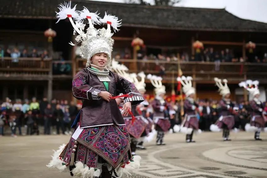 在黔东南州,有一种流传许久的,始于唐宋之前,盛于明清之后的舞蹈——古瓢舞;每逢佳节,苗家姑娘会头戴银饰,身穿绣有彩色抽象的龙、鸟,缀有白羽毛的衣裳,在琴音下摇曳起舞。