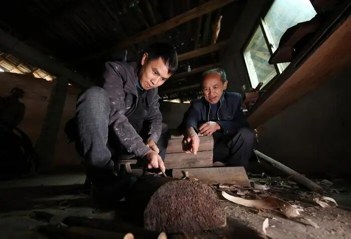 肖光华(右)指导徒弟制作思州傩戏傩技表演用的面具 新华社发(胡攀学 摄)