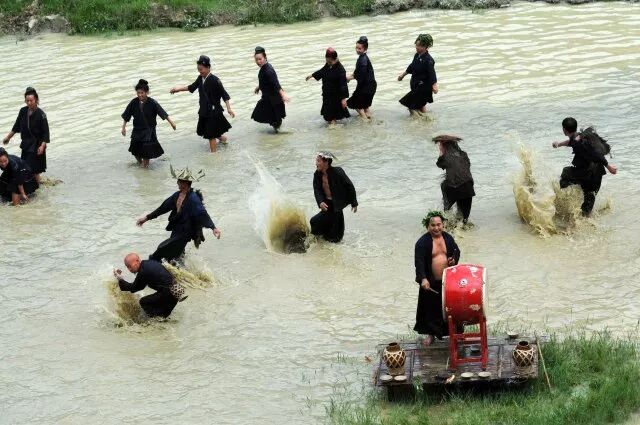 4、一般的节庆活动以单一的活动场所为主,且活动内容相同。而“苗族水鼓节”则分两部分举行,活动内容不相同。前一部分在水边举行,以祭祀先人为目的,同时还有娱人、娱神之意,后一部分在岸上举行,以娱乐为主,为一般节日所不见。