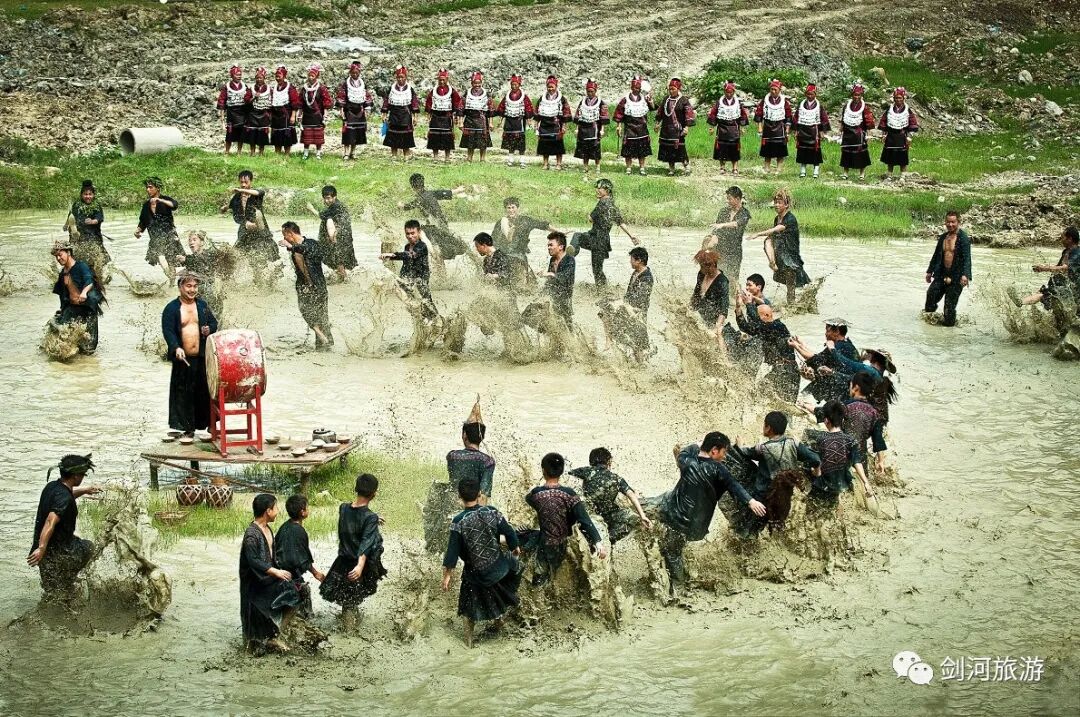 每年农历六月第一个卯日之后的第一个丑日举行“起鼓”仪式。当天上午,人们从“甘栋榔”(苗语,寨中一地名)开始“走寨”。之后聚集到村前的小溪边(即老祖公被掩埋之地)举行“起鼓”仪式,之后,由两男子抬着木鼓置于小溪的中央,众男子在溪中一边踩鼓,一边拊水掷泥嬉戏。